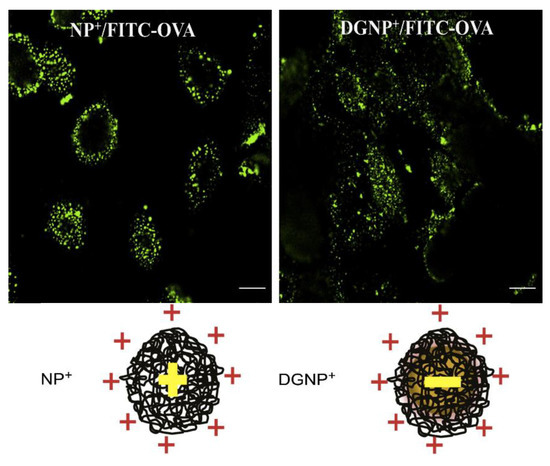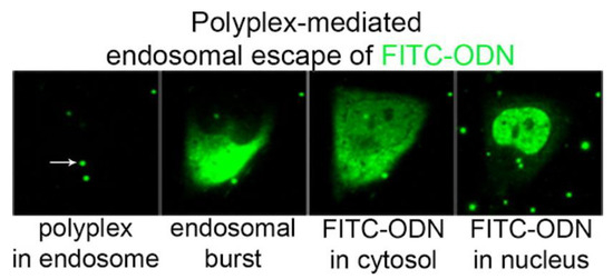 An important biomolecule that can be carried by cationic polymers is DNA, essential for DNA vaccines despite its relative delivery inefficiency when compared to viral vectors [164]. Cell internalization of the polyplexes (cationic polymer/DNA) and subsequent release of their cargo requires translocation across endosomal and/or nuclear membranes, a determinant factor for therapeutic efficiency, and hence, potential clinical impact. Polyplexes or lipoplexes (cationic lipid/DNA) essentially follow a similar intracellular route once captured by endocytosis [165,166]. Figure 10 shows the intracellular trafficking of a fluorescently labeled oligo-deoxynucleotide (ODN) carried in PEI/fluorescein isothiocyanate-labelled ODN (FITC-ODN) polyplexes; fluorescence is firstly inside the endosome, then in the cytosol after escaping from the endosome due to the endosomal burst, and finally in the cell nucleus as reproduced from ur Rehaman et al. 2013 [166]. The limited efficiency of ODN delivery to the nucleus relates to the fact that most endosomes did not burst.