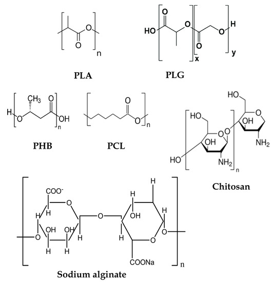 Chemical structure of some biocompatible polymers such as polylactic acid (PLA), poly (lactic-co-glycolic acid) (PLGA), polyhydroxybutyrate (PHB), polycaprolactone (PCL), chitosan, and sodium alginate.
