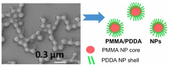 Scanning electron micrograph of PMMA/PDDA NPs and schematic representation of the PMMA/PDDA NPs structure with their core–shell nanostructure that occurs at low ionic strength. Reproduced from reference [160].