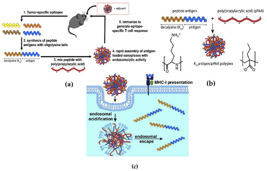 - Qiu, F.; Becker, K.W.; Knight, F.C.; Baljon, J.J.; Sevimli, S.; Shae, D.; Gilchuk, P.; Joyce, S.; Wilson, J.T. Poly(propylacrylic acid)-peptide nanoplexes as a platform for enhancing the immunogenicity of neoantigen cancer vaccines. Biomaterials 2018, 182, 82–91. [Google Scholar] [CrossRef]