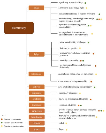 The text analysis revealed the clustered vision and promissory narrative created by the Biomimicry Global Network. By applying future-oriented terms, as is shown in the word tree, biomimicry supposes a more desirable future and in so doing presupposes an undesirable present; which is unsustainable, non-regenerative, ill-adapted, and even unhealthy. Consequently, biomimicry’s promise ties into a widely shared desire for a transition from our current reality to a potentially more sustainable future. The collective BGN narrative expresses promise in the realms of innovation, sustainability, and transformation. These categories link to the intentions for practicing biomimicry as described by Pedersen Zari []. The categories are further utilized to understand biomimicry’s promise as it is communicated by the BGN.