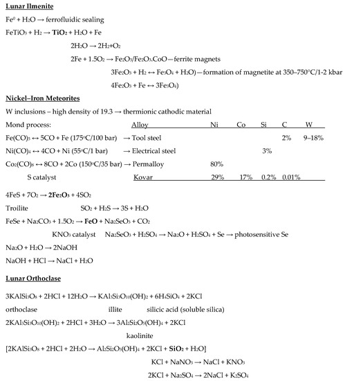 - Localised surface and subsurface nickel–iron meteorite material is expected to occur at some craters from which tunico (tungsten–nickel–cobalt) metals and selenium can be extracted through the Mond process for the construction of a range of iron alloys;