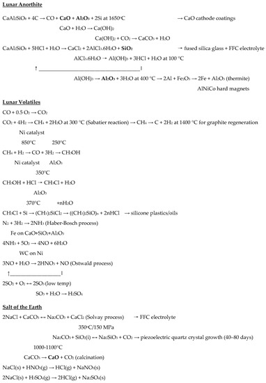 Any lunar processing facility will comprise at least two stages—the first stage is to extract volatiles and water vapour in the regolith at 600–800 °C. A simple fractionating column can exploit the wide separation of condensation temperatures of different volatiles (assuming 1 atm pressure): He (4.2 K), H2 (20 K), N2 (77 K), CO (81 K), CH4 (109 K), CO2 (194 K), H2S (213 K), SO2 (263 K) and H2O (373 K). In all cases, these reagents are scarce and must be husbanded through recycling, especially the recovery of carbon compounds. The second stage processes native minerals thermochemically to reduce them for the extraction of desired materials (including the capturing of oxygen for storage). We propose the Metalysis FFC (Cambridge) process as the primary processing technique [117,118]. This electrochemical technique uses a CaCl2 electrolyte at 950 °C to reduce any mineral oxide into high-purity metal, using a solid-state cathode comprising the mineral oxide to be reduced and a graphite anode. Oxygen is evolved at the anode, which corrodes the graphite anode into CO/CO2 which must be recovered and recycled through the Sabatier process. If the mineral is a mixture of oxidised metals, as many minerals are (lunar mineralogy is dominated by plagioclase feldspars, pyroxenes, olivines and ilmenite), direct reduction will yield mixed-metal alloys. These mongrel alloys, except in rare cases, do not yield particularly useful functional materials (except perhaps for structural purposes). Hence, to release useful functional materials, preprocessing of the silicate minerals will be required to present materials in pure oxide form for reduction using the Metalysis FFC (Fray Farthing Chen) process. Reagentless processes are favoured over those requiring reagents; reagents recovered from lunar soil in turn are favoured over reagents requiring import from Earth [119]. However, we must supply sodium and chlorine (conveniently, in the form of salt NaCl) from Earth, both of which are depleted on the Moon. However, it is employed as a source of reagents, which are not consumed but recycled. Furthermore, what is apparently a disadvantage may be employed to advantage—it offers a “salt contingency” to shut down self-replication if required through the denial of salt resources (kill switch) [120].