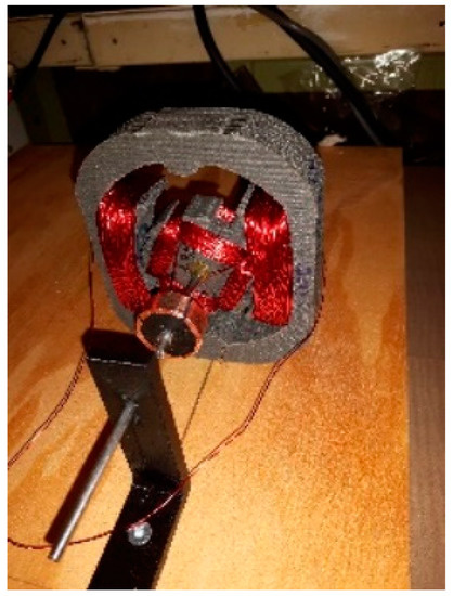 FDM-printed rotor and stator of Fe particles embedded in PLA matrix.