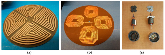 We then addressed the wire coils, initially for a pancake motor design. Initially, we FDM-printed Cu-particle-embedded PLA from Virtual Foundry, which successfully conducted low currents but melted when applying power voltages and currents (Figure 6a). It was not possible to use a post-printing sintering process because of the underlying PLA disk of magnetic PLA, which requires the PLA insulation to minimize eddy currents. This illustrates that 3D printing plastic data electronics is all very well but this is not compatible with power electronics—a self-replicator will require an approach to electronics that is compatible with both (exaptation principle) to minimise manufacturing overheads. We replaced the PLA-based wiring with LOM-based adhesive copper sheet which we etched to leave copper foil coils (Figure 6b), which we tested successfully in a pancake motor configuration. We are currently working on applying the same adhesive cooper tape to a small DC motor design (for benchmarking with a commercial off-the-shelf DC motor), which requires the coil to be wound (Figure 6c). This is underway but proving to be challenging.
