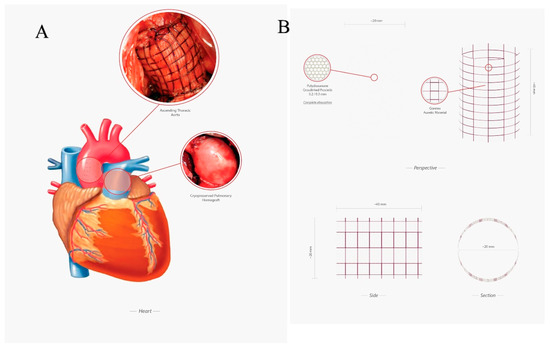 (A) Experimental model of Ross operation. Ascending aorta was replaced using a pulmonary autograft reinforced with semiresorbable prosthesis (up), the right outflow tract was reconstructed with the use of a cryopreserved pulmonary homograft (down); (B) Semiresorbable crosslinked prosthesis made by an external layer of e-PTFE and an internal layer of polydioxanone.