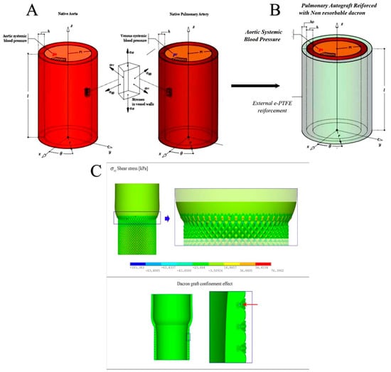 Geometry and the mechanical features of the native aorta and the native pulmonary artery (A) and the pulmonary autograft (B). (C) Illustration of the spurious shear stresses in the suture zone (Top), and the Dacron structure confinement acting on the pulmonary autograft (PA) pressurized vessel (Bottom).