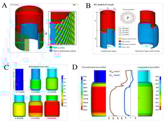(A) Pulmonary autograft reinforced with semiresorbable prosthetics integrated into the pulmonary autograft wall. Right. The geometry of the finite element (FE) model, with a detail showing the communication of the native aorta (in red) with the pulmonary artery tract (blue), integrated with the external e-PTFE structure at the time of full development (BSA 2.2) (B) Overall sketch of the finite element model reconstruction of the aorta–suture–autograft–annulus ensemble: undeformed system (left); deformed (at the maximum pressure level) model (right) and cross-section with applied pressure. At the bottom, the legend with the details of the elements used and distinguished for material properties. (C) Sequence of deformations at increasing pressure levels up to 80 mmHg. The contour plots refer to the displacements along the radial direction (in mm). (D) Hoop (circumferential) and longitudinal (axial) stress profiles as a function of the vessel axis (middle), with contour plot details showing the spatially inhomogeneous distribution of the stresses (in kPa).