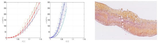 In Figure 5B, we report the uni-axial tests along the mechanically relevant directions, i.e., the longitudinal and circumferential ones, measured for the aorta and PA roots. From the stress–strain profiles, it emerged that the hyperelastic responses of both the vessels were anisotropic, with a classical increasing slope as the stretch grows. By comparing the aorta and PA, it is possible to highlight that the former exhibited a stiffer behavior in both the hoop and axial directions, in line with the consolidated literature. Additionally, strength values seemed to confirm the mechanical resistance hierarchy, being a higher stress threshold in the aorta with respect to PA counterpart. A biomechanically relevant result concerned the stress–strain response of the aorta and PA valve leaflets. In fact, as highlighted in Figure 6 Left panel, very similar qualitative and quantitative behaviors were exhibited by both tissues up to applied forces and prescribed stretches. This would explain the mechanical resistance and durability of pulmonary artery valves when transposed in aorta position in Ross operation, where PA is solicited by high-pressure regimes.