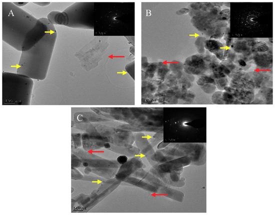 The characterization of the different ZnO supports and Au@ZnO-based catalysts was shown in our previous research [18]. On these catalysts, 1 wt.% graphene was incorporated. Figure 1 shows the HRTEM images and the selected area electron diffraction (SAED) patterns of the 10%Au@commercial ZnO–graphene (Figure 1A), 10%Au@ZnO NPs–graphene (Figure 1B), and 10%Au@ZnO NWs–graphene (Figure 1C) composites. The 10%Au@commercial ZnO–graphene composite consisted of non-homogenous particles with different sizes (lengths and diameters greater than 50 nm) and shapes. Homogeneous spherical gold nanoparticles, with diameters of less than ca. 10 nm, were distributed on the surface of the catalyst. Graphene sheets of different sizes were also distributed unevenly through the sample. According to Wang et al. [15], it is believed that close and homogeneous contact between Au, support, and graphene favors the transfer of photogenerated electrons between them, thus improving charge separation and photocatalytic efficiency. As in the case of the commercial catalyst, the 10%ZnO NPs–graphene catalyst showed non-homogeneous particles of different sizes and shapes, with lengths and diameters greater than 50 nm. The non-homogeneous gold nanoparticles were unevenly distributed throughout the sample, presenting a spherical morphology with diameters of less than 10 nm. Graphene was also unevenly distributed throughout the sample and served as a support for ZnO particles and gold nanoparticles. In the case of the 10%Au@ZnO NWs–graphene catalyst, the incorporation of graphene and gold considerably modified the pristine material. The catalyst consisted of non-homogeneous wires, with an estimated length greater than 300 nm and diameters above 50 nm. Gold nanoparticles, with spherical morphology and diameters of less than 10 nm, were distributed throughout the sample. Graphene also appeared to be unevenly distributed in the sample, but had intimate contact with the gold nanoparticles and the support. SAED patterns of synthesized gold–graphene-based composites were characteristic of monocrystalline materials.