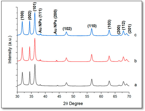 X-ray diffractometer (XRD) diffraction patterns for 10% Au@commercial ZnO–graphene (a); 10%Au@ZnO NPs–graphene (b); and 10%Au@ZnO NWs–graphene (c).
