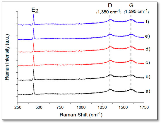 The Au@ZnO–graphene composites containing gold loadings of 5 wt.% and 10 wt.% were characterized by Raman spectroscopy (see Figure 3). Graphene has two characteristics peaks at ca. 1350.0 cm−1 and 1595.0 cm−1, known as D- and G-bands, respectively [37]. The D-band (1350 cm−1) has been related to the defects and structural disorder in graphene sheets, whereas the G-band (1595 cm−1) has been ascribed to the stretching of the sp2 hybridized carbon–carbon bonds [37]. These two bands were observed in all the gold–graphene composites, including those with gold loadings of 1 wt.% and 3 wt.%. The ratio of the intensity between the D- and G-band is a measure of the degree of disorder in graphene [38]. The narrow strong band at ca. 437.0 cm−1 (E2 modes) is present in all the composites and it has been ascribed to motion of Zn in the wurtzite phase [16]. No gold bands were found for any of the composites.