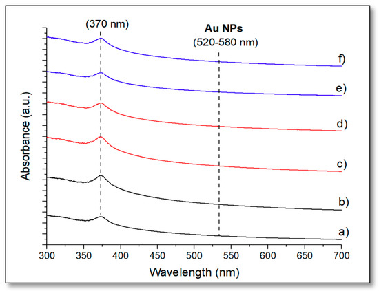 Ultraviolet–visible light (UV–vis) spectra of different composites: 5%Au@commercial ZnO–graphene (a); 10%Au@commercial ZnO–graphene (b); 5%Au@ZnO NPs–graphene (c); 10%Au@ZnO NPs–graphene (d); 5%Au@ZnO NWs–graphene (e); and 10%Au@ZnO NWs–graphene (f).