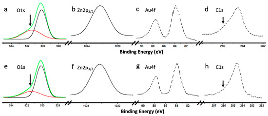 The catalysts were also characterized by XPS. Figure 5 shows the most relevant spectra of 10%Au@ZnO NWs–graphene and 10%Au@ZnO NPs–graphene. In both systems (Figure 5a,e), the O1s showed a main peak at ca. 530.2 eV, which was assigned to O2− ions in the Zn–O bonds, and a shoulder around 531.5 eV, assigned to O2− ions in the oxygen deficient regions, respectively [18]. As observed, the contribution of this secondary peak was clearly greater in ZnO NWs than in ZnO NPs. As it will be shown later, the highest reactivity was observed in catalysts based on ZnO NWs, so this behavior could be justified thanks to the existence of crystalline defects, as already described in previous works [18]. In fact, surface defects in crystalline ZnO affect its electrical properties, increasing electrical conductivity, which undoubtedly could have positive effects on photocatalysis with these materials. In both catalysts, the Zn2p3/2 spectra showed a single component that was unambiguously assigned to Zn2+ in ZnO (see Figure 5b,f). The presence of metallic gold (Au0) was evidenced by the presence of a doublet in the emission peak at ca. 84.0 eV (4f7/2) and 87.7 eV (4f5/2) (Figure 5c,g) [40]. No components were observed that could show the presence of Au3+, coming from the precursor (HAuCl4 • 3H2O), which evidenced the complete reduction of gold. Figure 5d,h shows the transition corresponding to C1s. The main peak observed at ca. 284.6 eV was assigned to the carbon backbone of aliphatic/aromatic (sp3/sp2) carbons, while the component indicated by an arrow, around 286.0 eV could be attributed to carbon in C–O and C–O–C groups [41,42], and to contamination by adsorption of oxidized species (CO, CO2).