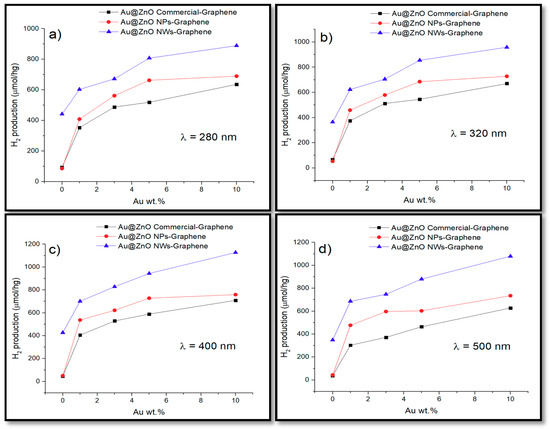 Au@ZnO NWs–graphene catalysts showed the highest hydrogen production (1127 μmol/hg) with a gold loading of 10 wt.% at 400 nm, representing a difference of 685 μmol/hg when compared to the unmodified ZnO NWs catalyst (442 μmol/hg). The highest amount of hydrogen produced at 400 nm with the 1%Au@ZnO NWs–graphene, 3%Au@ZnO NWs–graphene, and 5%Au@ZnO NWs–graphene catalysts was 701 μmol/hg, 828 μmol/hg, and 944 μmol/hg, respectively.