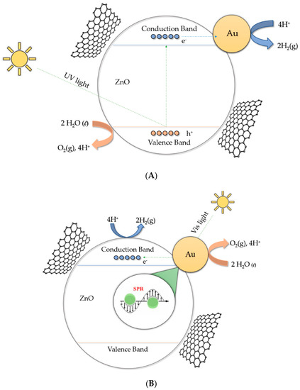 In the case of Au/graphene–TiO2, over the years different possible mechanisms have been proposed for the production of hydrogen by water splitting (see Figure 7). One of the most widely accepted is that when compounds are irradiated with UV light (Figure 7A), a direct photoexcitation of TiO2 with photons with energy larger than the bandgap (λ < 380 nm) leads to the generation of electrons in the conduction band, and electron holes in the valence band of the semiconductor [51]. The electron in the conduction band will move to the Au NPs, acting as electron buffers and catalytic sites for hydrogen generation [52]. When irradiated with visible light (λ > 500 nm) photoexcitation of Au NPs occurs, and electrons from the Au NPs are injected into the TiO2 conduction band leading to the generation of holes in the Au NPs and electrons in the TiO2 conduction band [51,52]. Then, the water molecule gains the electrons in the conduction band and hydrogen is produced. Evidence of the proposed mechanism is the fact that the photocatalytic response for hydrogen generation is consistent with the absorption of the Au surface plasmon band. The incorporation of graphene creates a p–n junction, which improves the separation of photogenerated charges, and the electrons are excited to the conduction band [26]. The electrons transferred from the conduction band of TiO2 are injected into the reduced graphene in a graphene/TiO2 system because the graphene/graphene redox potential is slightly lower than the CB of TiO2 [26]. In addition, some conduction electrons of TiO2 likely transfer directly to the Au NPs deposited on the surface of the semiconductor by ohmic interconnection or to carbon atoms on the graphene sheets, and the electrons then react with the adsorbed H+ ions to form H2 [25,26]. This creates a synergistic effect between both co-catalysts, and they can effectively suppress photogenerated charge recombination, enlarge the active adsorption sites, and consequently enhance the photocatalytic activity [16,25,26]. When irradiated with visible light (λ > 500 nm) (Figure 7B) photoexcitation of Au NPs occurs, and electrons from the Au are injected into the ZnO conduction band, leading to the generation of holes in the Au NPs and electrons in the ZnO conduction band [18]. The water molecule gains the electrons in the conduction band and hydrogen is produced. This proposed mechanism is an oversimplification since different studies [18,19,20] have determined that, due to the gold/semiconductor interfacial contact, the conduction band of the semiconductor undergoes shift toward more negative potentials [18]. Thus, the charge distribution between the Au NPs and the semiconductor causes a shift of the Fermi level toward more negative potentials [18,19].