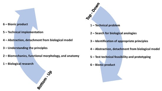 Researchers have introduced two main approaches to the biomimetic design process: the problem-based approach and the solution-based approach. The former is driven by inspiration from biology through a non-linear or dynamic progression, which provides feedback and refinement in the loops. On the other hand, designers seek solutions by identifying the problem. This leads biologists to relate the problem to an organism that has solved a similar problem. The solution-based approach is used when the design process initially depends on the scientific knowledge of biologists and scientists, rather than on human design problems [6,9]. Besides, the transformation of the strategies available in nature into technical solutions for biomimetic designs could become a complicated multidisciplinary process. Process complexity increases when conflicts arise by integrating a series of strategies from different organisms to attain improved solutions [8].