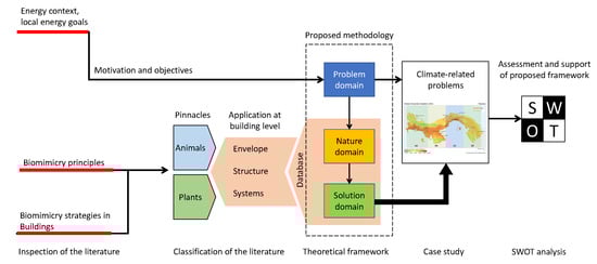The core of this study reaches building applications using strategies inspired by nature. These building applications are climate-related solution problems, and thus, the searching for solutions regarding three important climate types is of high interest: coastal areas, arid areas, and tropical forest areas. Such searching is motivated by the energy context and local energy goals established by current regulations in Panama. Therefore, this document is organized as presented in Figure 2, which is divided into three parts. The starting point lies in the theoretical framework of biomimicry strategies, followed by the motivations and objectives that are raised from the interest in meeting the current regulation objectives. This might allow us to propose a framework for introducing biomimicry-level-based strategies for building designs in Panama. Finally, possible risks are assessed by analyzing related weaknesses and threats that may arise from the introduction of such strategies in a developing country as Panama. However, also, associated strengths and opportunities are presented in a SWOT analysis to support such a framework.