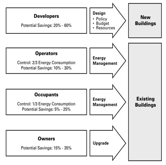 The same attitude was mimicked or could be imitated in buildings as active systems. Buildings could rotate, use movable shading devices, windows, and controlled wind catch. It could also be transformed into constant features like constructing underground buildings or raise them above the heated ground with high columns [20]. Notwithstanding their different perspectives, developers who mandate energy-efficient designs, building operators who employ effective management practices, and educated, energy-conscious tenants, can significantly reduce energy consumption of buildings if working together toward a common objective (Figure 3) [21].