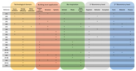 Therefore, a brief literature review is presented here by filtering existing studies regarding biomimicry approaches applied explicitly to buildings for the following aspects: (i) air ventilation or conditioning systems, (ii) energy efficiency, and (iii) the minimization of resources through changes in shape or patterns. However, the approaches presented here are organized in three building-based levels: (a) envelope, (b) structure, and (c) system by differentiating the organism-based design, grouping them as animals or plants. The biomimicry approaches identified are then categorized, based on the framework presented in Table 1, by building application, biomimicry level, and technological domain (Figure 4).