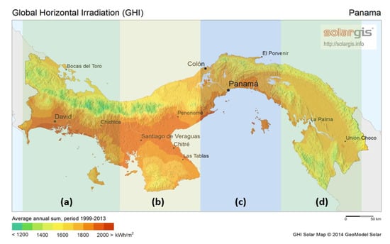 Areas with different climate-types within the humid tropical climate in Panama: (a) area with tropical forest and template-like zone, (b) arid area, (c) highly urban regions rounded by tropical forest, (d) area with heavy tropical forest. All areas possess coastal zones. SolarGIS © 2014 GeoModel Solar.