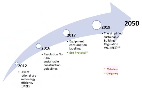 As presented before in Section 1.1, the motivations of this investigation are to bring options to the increasing demand for reducing the energy consumption in the building sector. Since 2012, Panama has been increasing their effort towards the rational energy use and energy efficiency in buildings (see Figure 11), through the inclusion of the Guidelines for Sustainable Construction (Resolution No. 3142) in 2016. Moreover, in 2017, the implementation of energy consumption labels for building equipment was included, followed by the development of an “Eco Protocol” which give recommendations of the energy and water usage, for reducing consumption in existing buildings (retrofitting) [66]. Such recommendations are based on the climate analogy between Panama and Singapore, which has a tropical rainforest climate with relatively uniform temperature and pressure, high humidity, and abundant rainfall.