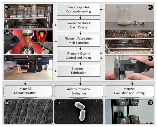Schematic illustration for the process followed for the creation of poly-Lactic Acid (PLA)/silver nanoparticle (AgNP) nanocomposite filaments, for their characterization as well as the study of their antimicrobial and mechanical properties: (a) PLA, AgNO3 and PEG or PVP (reducing agents) powders used for the reactive melt mixing, (b) the drying process of the powders/ materials before the reactive melt mixing process, (c) the PLA/AgNP filament fabrication via melt extrusion process, (d) the drying process of the produced PLA/AgNP nanocomposite filaments, (e) measurement of the produced filament diameter to be used for the FFF 3D printing process, (f) 3D printing FFF process for the manufacturing of the samples, (g) SEM image of the 3D printed samples’ side surface showing the additively 3D printed layers of the samples, (h) SEM typical image of bacteria attached onto the samples surface after different durations in contact with the antibacterial 3D printed samples used in the antibacterial tests carried out in this work, (i) 3D printed dog bone-shaped sample during tensile testing.