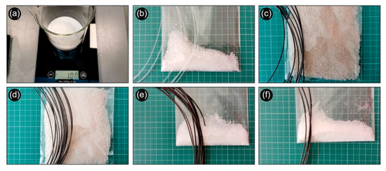 (a) Determining the wt. concentration for the creation of the different recipes (b) Neat PLA powder and the filament produced with this powder (c) 100 g (PLA): 20 g (AgNO3): 10 g (PEG), hereafter denoted as PLA/Ag/PEG (rec-01) powder and the filament produced with this powder (d) 100 g (PLA): 10 g (AgNO3): 5 g (PEG), hereafter denoted as PLA/Ag/PEG (rec-02) powder and the filament produced with this powder, (e) 100 g (PLA): 20 g (AgNO3): 10 g (PVP), hereafter denoted as PLA/Ag/PVP (rec-03) powder and the filament produced with this powder, (f) 100 g (PLA): 10 g (AgNO3): 5 g (PVP), hereafter denoted as PLA/Ag/PVP (rec-04) powder and the filament produced with this powder.