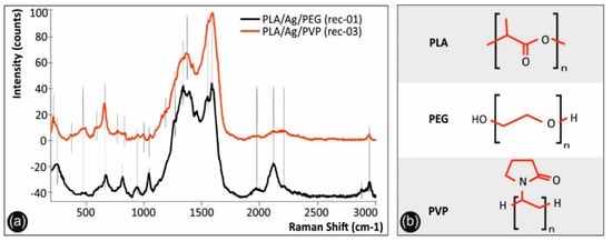 Figure 3a shows the Raman spectra of PLA/Ag/PEG (rec-01) and PLA/Ag/PVP (rec-03) 3D printed samples, while Figure 3b the molecular architectures of PLA, PEG, and PVP. It should be mentioned that only the PLA/Ag/PEG (rec-01) and PLA/Ag/PVP (rec-03) spectra are depicted, since they have been found to exhibit identical spectral features compared to that of PLA/Ag/PEG (rec-02) and PLA/Ag/PVP (rec-04) materials, respectively. It is known from literature that silver presents a lattice vibrational mode between 50 and 300 cm−1, which depends on the chemical compound silver is present, i.e., as oxide, nitrate, chloride or as some other compound [55]. Specifically, the peak located at 244 cm−1 for the PLA/Ag/PEG spectrum, as well as a “shoulder” in the case of PLA/Ag/PVP system, corresponds to the metallic AgNPs formed, being in good agreement with the Raman spectrum of 99.99% pure silver wires reported elsewhere [56].