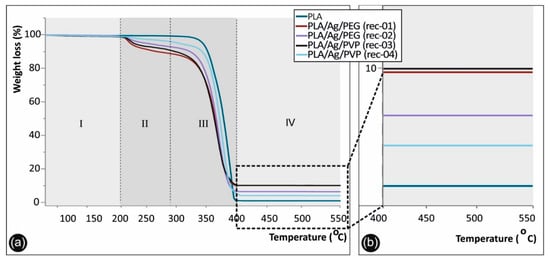The final temperature window (IV) of 374 to 550 °C is mainly included to demonstrate the remaining material after all polymer has been decomposed, which is attributed to the generated AgNPs within the PLA matrix as solid metallic particles that are stable up to 550 °C (even up to 1000 °C that the TGA experiments left to run). The remaining material at 550 °C for the different PLA/Ag nanocomposite filament, attributed to the AgNPs grown within the PLA matrix, is 9.37% (PLA/Ag/PEG rec-01), 4.61% (PLA/Ag/PEG rec-02), 9.45% (PLA/Ag/PVP rec-03), and 4.06% (PLA/Ag/PVP rec-04), respectively. All the solid AgNP remaining material at above 400 °C for the different samples could be seen in the magnified temperature range of 360–580 °C in the right hand-side, while as mentioned above the PLA, PEG, and PVP materials have been already decomposed at lower temperatures.