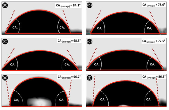 Figure 5 shows the water contact angle onto the 3D printed different samples. Namely, Figure 5a,b correspond to the neat 3D printed PLA with 100 and 300 µm printed layer thickness, respectively. Figure 5c,d represent the H2O contact angles of PLA/Ag/PEG (rec-01) with 100 and 300 µm printed layer thickness, respectively. Finally, Figure 5e,f show the H2O contact angle of PLA/Ag/PVP (rec-03) with 100 and 300 µm printed layer thickness, respectively.
