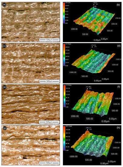 Optical microscopy 2D (left hand-side) and 3D (right hand-side) images of 3D printed PLA/AgNP nanocomposites (at 100 µm printed layer thickness), utilizing PLA/Ag/PEG (rec-01)—(a,b); PLA/Ag/PEG (rec-02)—(c,d); (PLA/Ag/PVP (rec-03)—(e,f); and PLA/Ag/PVP (rec-04)—(g,h) extruded nanocomposite filaments, respectively. The 500 µm scale bar is inserted and shown in each figure in the left hand-side images, while the respective 3D images are shown in the right hand-side with the corresponding color scale bar indicating the micro-roughness of each sample.