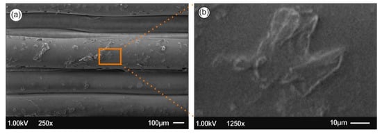 Figure 7 and Figure 8 present the 3D printed samples microstructure investigated from the 3D printed side-surface (all samples shown with 300 µm printed layer thickness), at low magnification demonstrating the printing process features, as well as at high magnification showing the existence of AgNPs. Specifically, Figure 7a presents the microstructure of neat PLA with a layer thickness of approximately 300 μm, being in a good agreement with the resolution of the Intamsys Funmat HT 3D printer manufacturer’s technical specifications in terms of printer’s resolution. Figure 7b shows an amorphous PLA surface morphology, typical for polymeric materials.
