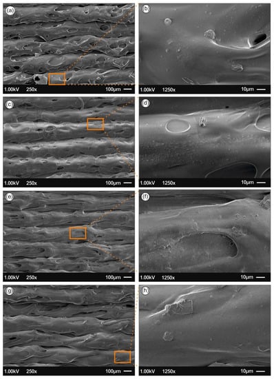 SEM images of the side-surface microstructure and morphology for the different 3D printed samples in this study at two different magnifications (all 3D printed samples with 300 µm printed layer thickness): (a,b) PLA/Ag/PEG using rec-01 filament, (c,d) PLA/Ag/PEG using rec-02 filament; (e,f) PLA/Ag/PVP using rec-03 filament; and (g,h) PLA/Ag/PVP using rec-04 filament.