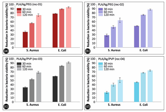 Antibacterial activity of (a) PLA/Ag/PEG (rec-01), (b) PLA/Ag/PEG (rec-02), (c) PLA/Ag/PVP (rec-03) and (d) PLA/Ag/PVP (rec-04) 3D printed PLA/AgNP nanocomposites with 100 µm 3D printed layer thickness, against S. aureus and E. coli after 30, 60, and 120 min of contact. Mean values do not differ significantly (p < 0.05).