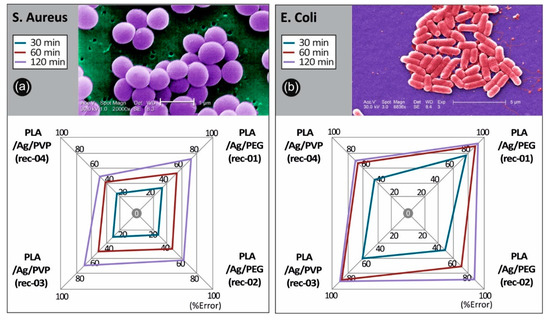Comparative spider graphs for the antibacterial behavior for the four 3D printed PLA/AgNP nanocomposites produced in this work (with 100 µm 3D printed layer thickness) against (a) S. aureus and (b) E. coli after 30, 60, and 120 min of contact. Values are mean. Mean values do not differ significantly (p < 0.05).