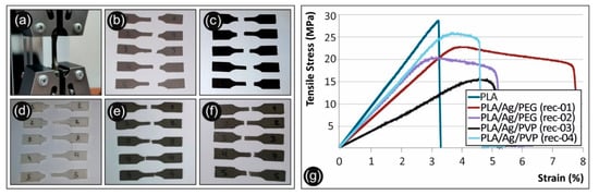 (a) Tensile test of a specimen, (b) Failed PLA/Ag/PEG (rec 1) specimens after the tensile tests, (c) Failed PLA/Ag/PEG (rec 2) specimens after the tensile tests, (d) Failed pure PLA specimens after the tensile tests, (e) Failed PLA/Ag/PVP (rec 3) specimens after the tensile tests, (f) Failed PLA/Ag/PVP (rec 4) specimens after the tensile tests, (g) Tensile stress vs. strain graphs for the neat PLA and the four recipes prepared in this work. All graphs are from the no 1 specimen of each case studied.
