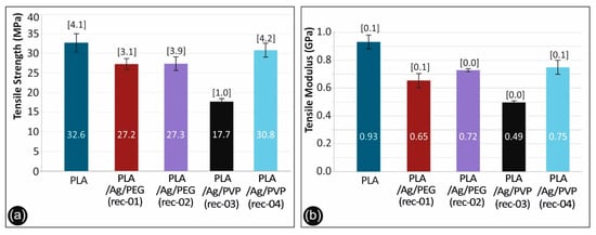 As it can be observed, there is a knock-down effect on the tensile strength of the 3D printed PLA/Ag/PEG (rec-01), PLA/Ag/PEG (rec-02), PLA/Ag/PVP (rec-03), and PLA/Ag/PVP (rec-04) as compared to the neat PLA 3D printed specimens. This is more precisely attributed to the low molecular weight PEG (Mn = 4600 g/mol) and PVP (Mn = 10,000 g/mol) additives in PLA/Ag/PEG (rec-01 and rec-02) as well as PLA/Ag/PVP (rec-03 and rec-04), respectively; utilized as the macromolecular reducing agents for the creation of AgNPs in the four different blend recipes. Moreover, it can be seen also that the effect of strength reduction is more prominent for the PLA/Ag/PEG (rec-03) as compared to the reference PLA. In general, the tensile strength knock-down is not significant as compared to the neat PLA reference material for all recipes tested, except the PLA/Ag/PVP (rec-03). Due to the reasons explained above, a minor decrease in the mechanical properties was expected. The main aim of this work was not to increase the mechanical properties of the produced nanocomposites, but to produce nanocomposites with improved antibacterial and other properties and test the mechanical behavior of the parts manufactured with these nanocomposites, which were expected to be similar to the polymer matrix material. This is achieved with the recipes implemented and tested in this work.