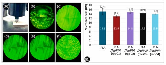 (a) Measuring the Vickers Micro-Hardness of a specimen, (b) PLA/Ag/PEG (rec 1) specimen, (c) PLA/Ag/PEG (rec 2) specimen, (d) Pure PLA specimen, (e) PLA/Ag/PVP (rec 3) specimen, (f) PLA/Ag/PVP (rec 4) specimen, and (g) Micro-Hardness Vickers results of neat PLA and the four recipes prepared in this work.