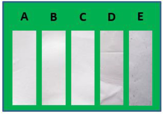 Illustration of the fabricated polylactic acid (PLA) scaffolds for the needs of the current investigation. (A) Pristine PLA, (B) modified PLA with 1% hydroxyapatite (HAP), (C) modified PLA with 2% HAP, (D) modified PLA with 1% multi-walled carbon nanotubes (MWCNTs) and (E) modified PLA with 2% MWCNTs.
