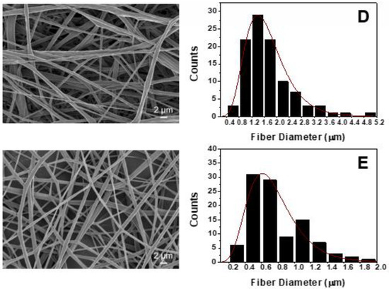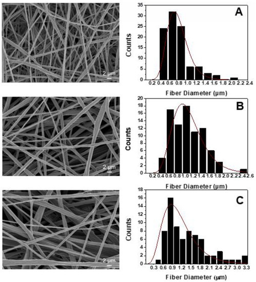 The fiber diameter measurements were obtained by image processing with imageJ software (NIH, Bethesda, MD, USA). By using different thresholds, the SEM micrographs were converted to binary images. At least 150 fiber diameters were measured (50 measurements from three different samples’ images), while the average value and the standard deviation (SSD) were reported. In addition, the statistical test for the measured values of the fiber diameter was carried out by using the OriginPro with 95% confidence interval to determine the fiber diameter distribution, which best describes the experimental data.