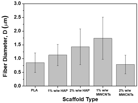 Figure 2 provides the SEM images that arose from each scaffold type together with the fiber diameter distribution histograms, according to specifications described in Section 2.3. Figure 2A–E corresponds to the pristine PLA (Figure 1A), to the 1% HAP modified (Figure 1B), to the 2% HAP modified (Figure 1C), to the 1% MWCNTs modified (Figure 1D) and to the 2% MWCNTs modified (Figure 1E), respectively. Based on the SEM images obtained for all material sets, cylindrical bead-free, non-woven and smooth fibers were fabricated for all cases, consisting of dense networks with no particular alignment (due to the SEP technique nature). The average fiber diameter values together with the standard deviations (SSDs) of them are summarized in Figure 3. According to the histograms of Figure 2 and the bar chart diagram of Figure 3, it was shown that nanomodification by HAP led to increased average fiber diameter. More precisely, the average fiber diameter was increased from 0.85 ± 0.35 μm for the nanofiller-free scaffolds to 1.13 ± 0.39 μm (33% increase) for scaffolds containing 1% w/w HAP, and to 1.43 ± 0.65 μm (68% increase) for scaffolds containing 2% w/w HAP. The current behavior observed (i.e., increases in the fiber diameter) is in line with the investigation of Morelli et al. [28]. On the other hand, the scaffolds containing 1% w/w MWCNTs exhibited higher average fiber diameter values, which was calculated to be more than doubled to 1.74 ± 0.76 μm (104% increase), while the samples containing 2% w/w MWCNTs exhibited slightly decreased values, by 8%, calculated to be close to 0.78 ± 0.34 μm. This behavior possibly occurred due to the increase in the electrical conductivity value of the solution, as the MWCNT quantity seems to have exceeded a threshold. Based on that, during the SEP, the average fiber diameter of the scaffold slightly decreased against the pristine ones. An analogous behavior was also observed in the investigation of Repanas et al. [34].