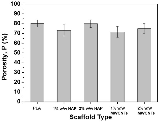 Scaffold nanomodification by HAP or MWCNTs in various nanofiller concentrations (1% and 2% w/w) is also expected to have an impact on the porosity value of the final sample. Based on that, the porosity value for all the scaffold types was calculated according to specifications described in Section 2.4, and is provided in the bar chart diagram of Figure 5. According to this figure, the general trend for all the scaffold types is the reduction of the porosity value by nanomodification. More precisely, the porosity mean value was reduced by 9%, 0.3%, 10.7% and 6.5% for the samples containing 1% w/w HAP, 2% w/w HAP, 1% w/w MWCNTs and 2% w/w MWCNTs, respectively. The current findings are in line with the investigations of Kostopoulos et al. [27.30], in which the scaffold nanomodification mainly contributed to a slight reduction of the porosity value compared to the pristine scaffold. However, based on Chen et al.’s [37] investigation, the current porosity values are expected to support the interconnectivity, the interaction and the proliferation procedure of the cells.
