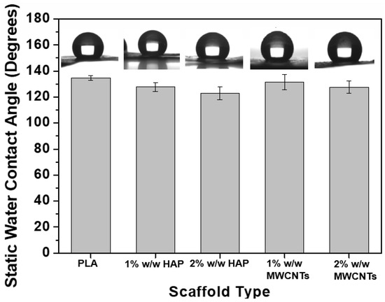 The current section investigates the effect of the nanofiller inclusion and their concentration on the hydrophilicity levels of the fabricated PLA scaffolds. In this regard, static water contact angle assay experiments were conducted according to specifications described in the Section 2.5. The bar chart diagram of Figure 6 provides the static contact angles for all the material sets.