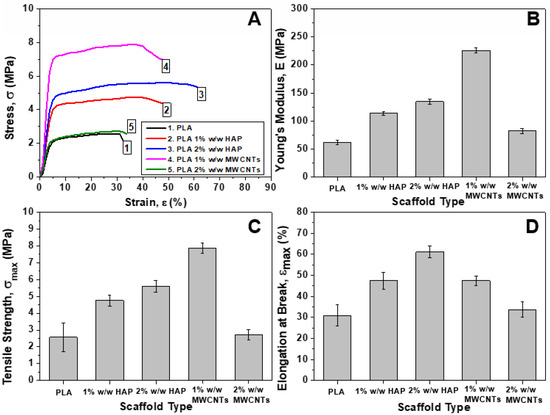 (A) Representative stress (σ) vs. strain (ε) % curves for the pristine PLA and nano-modified scaffolds (with 1% and 2% HAP, and 1% and 2% MWCNTs). Bar chart diagrams providing the tensile properties of PLA scaffolds that arose from uniaxial tensile tests; (B) Young’s Modulus (E), (C) Tensile strength (σmax), (D) Elongation at break (εmax) %. For all the tensile properties SSD values are provided.