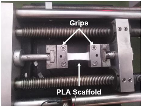Snapshot taken during the uniaxial tensile tests of the PLA scaffolds.