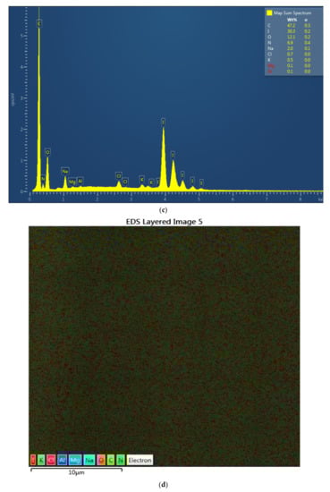 Antibiotic resistance is a danger for the existence of mankind causing morbidity and mortality []. Nosocomial infections due to ESKAPE pathogens are a burden on quality of life and health care systems [,,,]. New antimicrobial compounds are needed to assist the fight against resistant microorganisms. Plant-based antimicrobial agents have promising properties and depend on synergistic strategies []. We encapsulated the well-known plant Aloe vera and the microbicide iodine in a “smart” biocomplex with PVP, and investigated the antimicrobial properties. The morphology and composition of the biocomplexes were confirmed by SEM and EDS (Figure 1 and Figure 2). The SEM analysis revealed irregular and granular morphology with various particle sizes (Figure 1). The impregnated PGA suture exhibits a firm, homogenous coating on the surface compared to the plain control suture (Figure 1b,c). The EDS and EDS-layered images in Figure 2 verify the composition and uniform distribution of the biocomplexes. AV-PVP-I2 consists of C, O, N, I, Cl, K, Na, Mg and Al, with 60.3, 17.4, 8.8, 6.4, 3.5, 2.5, 0.9, 0.1 and 0.1 weight%, respectively (Figure 2a). The sample AV-PVP-I2-NaI shows higher weight percentages for Na with 30.3 and I with 2.0 compared to AV-PVP-I2 with 0.9 wt% for Na and 6.4 wt% for I (Figure 2c). Ray et al. [] investigated the EDS of Aloe vera barbadensis Miller, and reported Na, Mg, K, Ca, Cd, Al and P, with the two latter minerals in negligible amounts. Rana et al. found in their EDX analysis Al, K, Ca, Si, P and Cu in decreasing weight percentages []. The elemental distribution in AV depends highly on soil, location, climate and harvest season []. Therefore, the composition may vary individually from region to region and needs standardization for pharmaceutical uses [].
