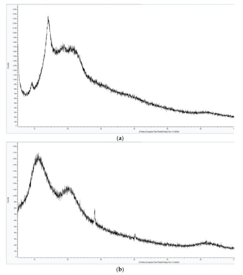 The XRD analysis of the complexes AV-PVP-I2 and AV-PVP-I2-NaI demonstrate similar diffraction patterns in Figure 3. The XRD graph in Figure 3a shows two sharp peaks in the range from 2θ = 9° and 14°, indicating that AV-PVP-I2 is not completely amorphous. The addition of NaI turns the semicrystalline compound AV-PVP-I2 into an amorphous polymer complex, demonstrated by the transformation of the two sharp peaks into broad signals (Figure 3). The XRD reveals a crystalline phase of NaI after adding sodium iodide into AV-PVP-I2 in Figure 3b, while the rest of the sample is entirely amorphous. Both graphs show no other phases derived from impurities.