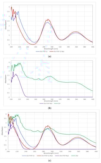 Ultraviolet-visible (UV-vis) spectrometric analysis of the samples. From up to down: (a) AV-PVP-I2 and AV-PVP-I2-NaI; (b) AV and AV-PVP-NaI; (c) AV, AV-PVP-I2 and AV-PVP-I2-NaI, and AV-PVP-NaI.