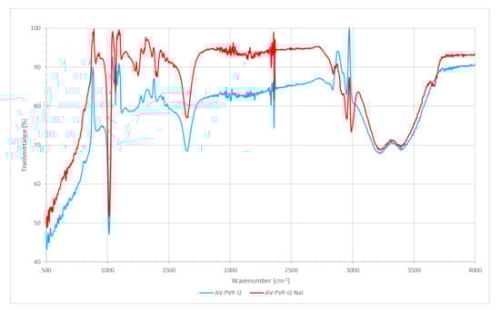 FT-IR analysis of AV-PVP-I2 and AV-PVP-I2-Na confirmed the composition of the samples. Figure 5 shows the FT-IR spectra of AV-PVP-I2 and AV-PVP-I2-Na.